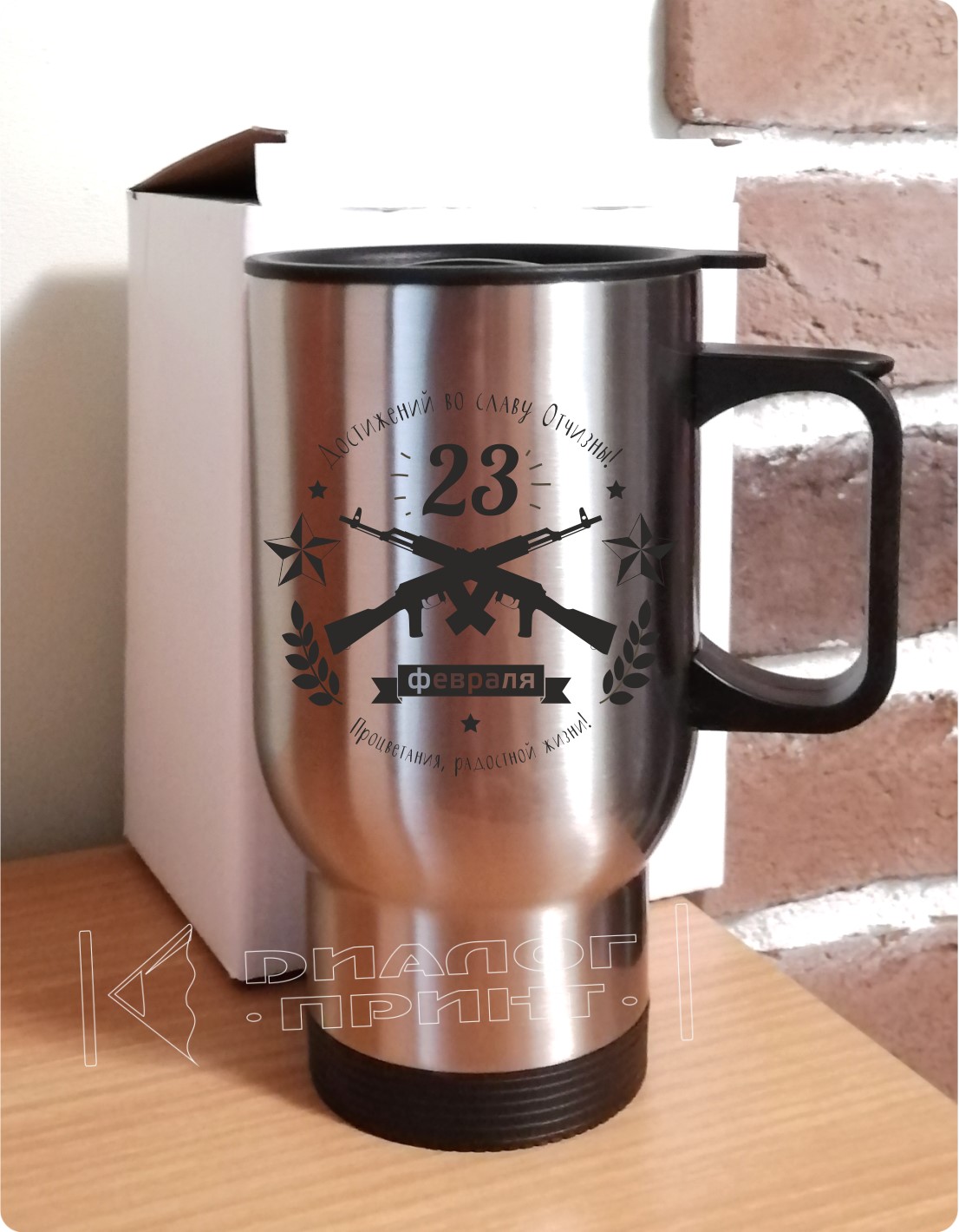 - Лучший вариант подарка для любителей путешествий. Удобная и компактная, она отлично подходит для размещения в автомобиле, рюкзаке и не только. Персонализированная надпись, которую мы нанесем по вашему желанию — верное решение для проявления особого внимания к адресату. Также можно заказать термокружку с поздравлениями, дружескими напутствиями, шуточными фразами и рисунками, что будет замечательным подарком на 23 февраля.
