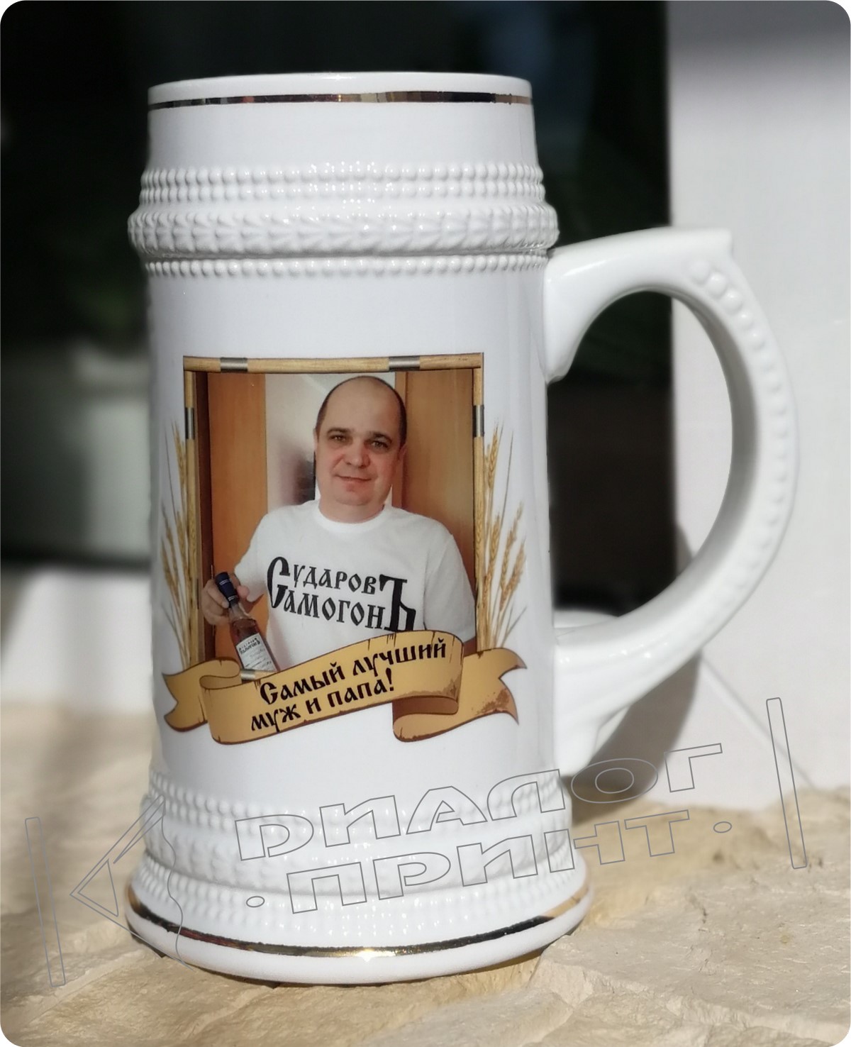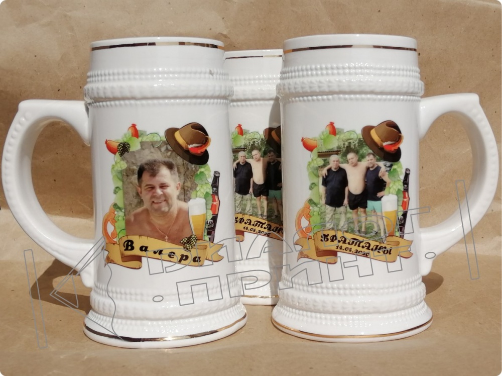 - Для тех мужчин, кто предпочитает пенный напиток, такая кружка станет идеальным подарком — керамика прекрасно сохраняет прохладу пива, а благодаря цветной сублимационной печати она смотрится оригинально. Можно заказать любую надпись, фотографию или рисунок. Мало того, пивная кружка будет является именной, если на ней написано имя хозяина. Всем понравится эта большая пивная кружка.