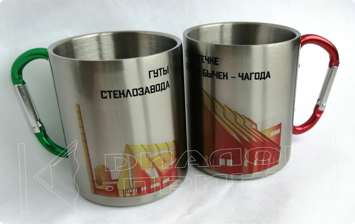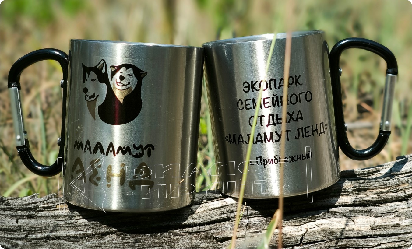 Вы можете заказать печать на металлической кружке с карабином логотипа, фотографии или рисунка.