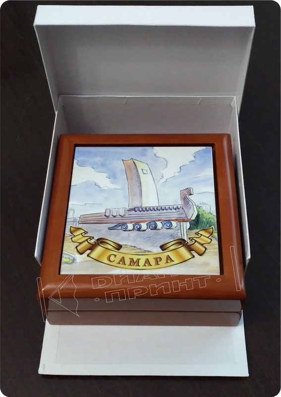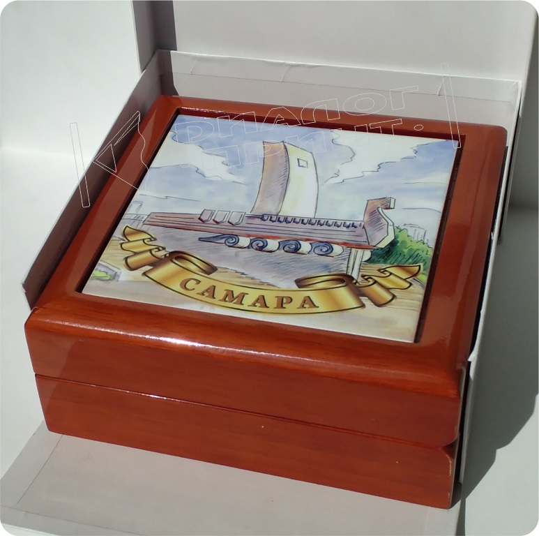 В нашей компании Вы можете купить шкатулку для украшений. В них можно поместить ключи, небольшие документы, ценные «безделушки», швейные и письменные принадлежности и даже деньги. Шкатулка из дерева покрытая лаком может быть необычным и функциональным презентом или послужить упаковкой для самых ценных подарков. На крышке шкатулки расположено углубление для керамической плитки, на которую можно нанести любое полноцветное изображение методом сублимации. Шкатулка упакована в коробку из плотного мелованного картона.